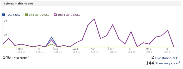 There's nothing earth-shattering about these stats, and you can track how many times your content is shared on Facebook through social plugins and analytics tools. However, the impressions and clicks data I had not been tracking previously through any third-party analytics services, so I find this really interesting.